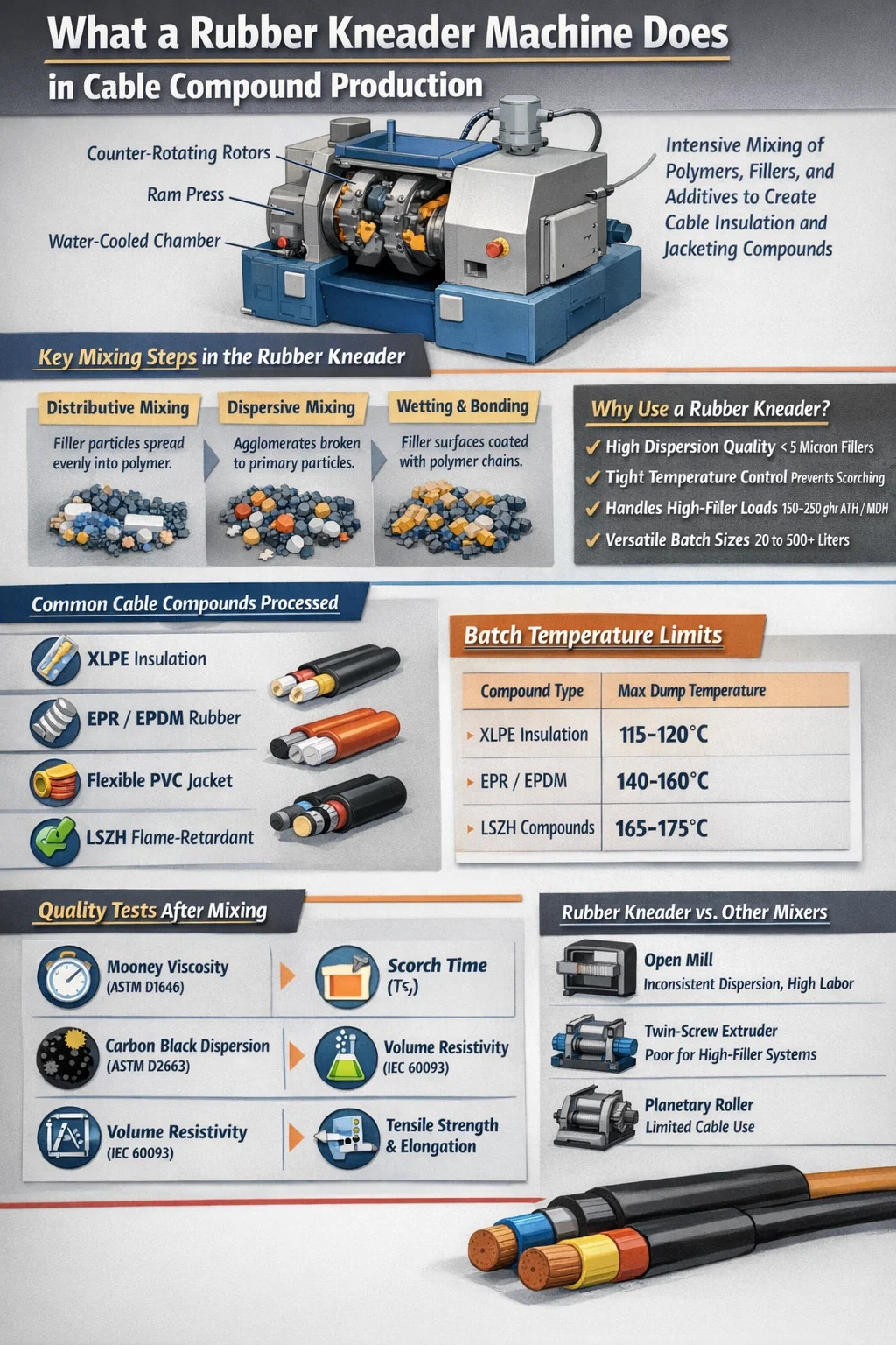 ケーブル メーカーは、幅広いエラストマーおよび熱可塑性エラストマー化合物ファミリーを扱っています。それぞれが混合装置に異なる要求を課しますが、ゴム混練機はそれらのすべてを日常的に処理します。