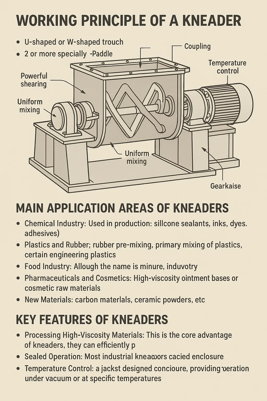 ミキサーまたはドウミキサーとしても知られるニーダーは、主に材料を強力に混合、混練、撹拌して均一な可塑性状態を達成するために使用される工業用装置です。超強力なミキシングボウルとして想像できますが、日常的な材料の代わりに、工業生産において高強度の混合が必要なさまざまな粘性、半固体、または高粘度の材料を扱います。